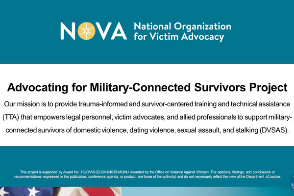 About This Course: This course provides an introduction to the unique challenges, legal frameworks, and considerations when working with military-connected survivors of domestic violence, dating violence, sexual assault, and stalking (DVSAS). Designed for community advocates, service providers, and legal professionals, the course emphasizes the importance of collaborative Coordinated Community Response (CCR) Teams with military and civilian partnerships to meet the needs of this population. Through expert-led presentations and interactive knowledge checks, participants will develop the skills to collaborate effectively across military and civilian systems, create tailored interventions, and build coordinated responses to support military-connected survivors. This course is developed through the "Advocating for Military-Connected Survivors" project funded by the Department of Justice Office on Violence Against Women. The Project Mission is to provide trauma-informed and survivor-centered training and technical assistance (TTA) that empowers legal personnel, victim advocates, and allied professionals to support military-connected survivors of domestic violence, dating violence, sexual assault, and stalking (DVSAS). If you need support, please contact our team at militarytta@trynova.org. This project is supported by Award No. 15JOVW-22-GK-04039-MUMU awarded by the Office on Violence Against Women. The opinions, findings, and conclusions or recommendations expressed in this publication, conference agenda, or product, are those of the author(s) and do not necessarily reflect the view of the Department of Justice. Read more